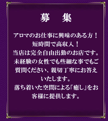 当店では、アロマオイルの効能と当店自慢のセラピストによるリンパマッサージの相乗効果による、癒しのひとときをお客様お一人お一人にお届けしております、自然で心やすらぐ優美な香りを、施術中はもちろんご帰宅お休みになってから翌日朝目覚めでまで楽しんで頂けます、どうぞゆっくりご堪能ください。